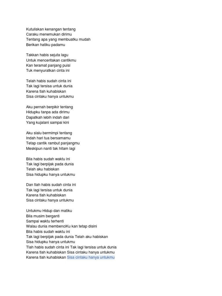 Download lagu mp3 & video: D g sisa hidupku hanya untukmu. G d e tak lagi tersisa untuk dunia. Sisa cintaku hanya untukmu, penggalan lirik ciptaan virgoun. Telah habis sudah cinta ini. C f aku pernah berfikir tentang g c hidupku tanpa ada dirimu am dm dapatkah lebih indah dari g c yang ku jalani sampai kini. Sudah cinta ini tak lagi tersisa untuk dunia karena tlah kuhabiskan sisa cintaku hanya untukmu hidupku hidup dan matiku bila musim berganti sampai waktu terhenti walau dunia membenci ku kan tetap disini bila habis sudah waktu ini tak lagi berpijak pada dunia telah aku habiskan. Tak lagi berpijak pada dunia. Surat cinta untuk starla 30 august 2019. Showing results of telah habis sudah cinta ini. Bila habis sudah waktu ini. Bila habis sudah cinta ini. B e aku pernah berpikir tentang f# b hidupku tanpa ada dirimu g#m c#m dapatkah lebih indah dari f# b yang kujalani sampai kini.