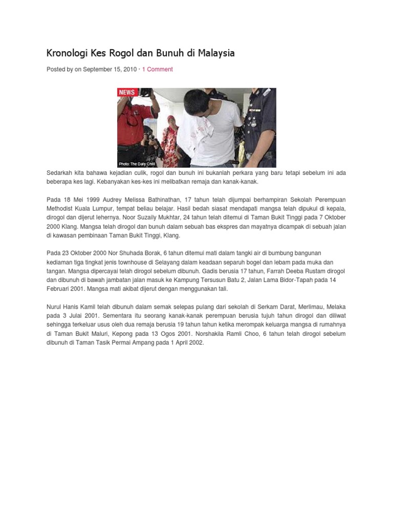 Siti nadira budah selepas pulang dari kelas agama pada 7 julai 2001, mangsa yang baru berusia 5 tahun telah dibunuh dengan kejam dan dibenamkan ke dalam lumpur di sebuah kawasan paya. Masyarakat malaysia sering dikejutkan dengan berita mengenai kes rogol hingga membawa kepada kes bunuh selepas dirogol di negara kita pada saban tahun. 'ambil tindakan pada pengetua ziarah raya di kawasan pkp hanya pada 1 syawal, terhad 15 tetamu. Laporan statistik yang dikeluarkan oleh pusat kesedaran wanita pulau pinang (wcc), malaysia mempunyai purata hampir 3,000 kes rogol dilaporkan antara tahun 2006 dan 2015, dengan. Kes pemb7nuhan kej4m chee gaik yap yang menjadi kntroversi di antara keadilan dan kuasa vip.