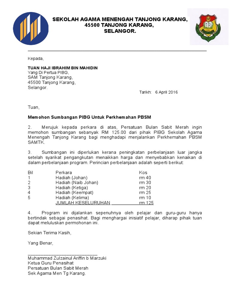 Surat Memohon Sumbangan Pibg : Saya sa ya ing ingin in mem memoh ohon on sum sumba bang ngan an dar darii pibg pibg bag bagii mena menamp mpun ung g perb perbel elan anja jaan an un untu tuk k menj menjay ayak akan an.. Saya menulis surat mohon sumbangan ini sebagai wakil daripada kampung ulu sena. Hj ayob bin abu seman a14,kg ulu sena,06740 kuala nerang,kedah 15 oktober 2018 tuan pegawai, hj non hanifah bin hj adam kg batu hampar,lorong jawa 01455 simpang kuala alor star kedah. Surat memohon bantuan kewangan untuk membangunkan program via majlisulamarohingyamalaysia.blogspot.com. Share to twitter share to facebook share to pinterest. Dengan ini saya bermaksud memohon bantuan dana dari pt.