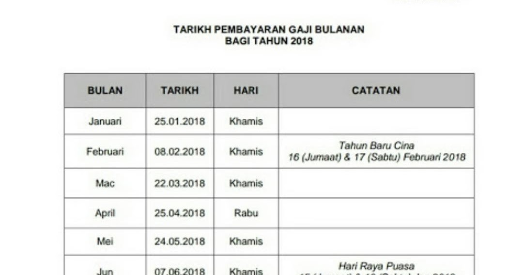 Untuk kemudahan semua penjawat awam, berikut adalah jadual pembayaran gaji 2018 kakitangan awam/ kerajaan untuk rujukan semua. So nak tak nk memang kena ambek tahu juga. Tarikh pembayaran gaji masih tertakluk kepada pindaan semasa oleh jabatan akauntan negara malaysia (anm). Pada tahun lepas dalam pembentangan bajet, kerajaan telah mengumumkan bonus penjawat awam sebanyak rm1,500 termasuk insentif khas aidilfitri kepada semua penjawat awam tanpa mengira gred. Sebelum ini penjawat awam telah menerima gaji awal dan gaji seterusnya adalah 40 hari, namun kini mereka boleh manarik nafas lega apabila jabatan akauntan negara dalam satu kenyataan mengumumkan tarikh pembayaran gaji bagi bulan julai diawalkan seminggu daripada 25 julai 2018. Berikut adalah jadual tarikh pembayaran gaji untuk kakitangan awam bagi tahun 2018, sepertimana lampiran a di dalam pekeliling akauntan negara malaysia bilangan 3 2017. Jadual dan tarikh gaji 2018 kakitangan kerajaan. Tarikh pembayaran gaji telah ditetapkan oleh kerajaan iaitu setiap 25hb bagi setiap bulan. Anda juga boleh save gambar kalendar di bawah yang. Oleh itu semua maklumat tepat Menarik tentang app ini ialah tarikh gaji 2018 ini dirujuk jadual gaji yang di keluarkan anm. Menarik tentang app ini ialah tarikh gaji 2018 ini dirujuk jadual gaji yang di keluarkan anm. Tarikh pembayaran gaji bulanan bagi tahun 2018 adalah seperti di lampiran 1 dan ditetap berdasarkan arahan perbendaharaan 105.